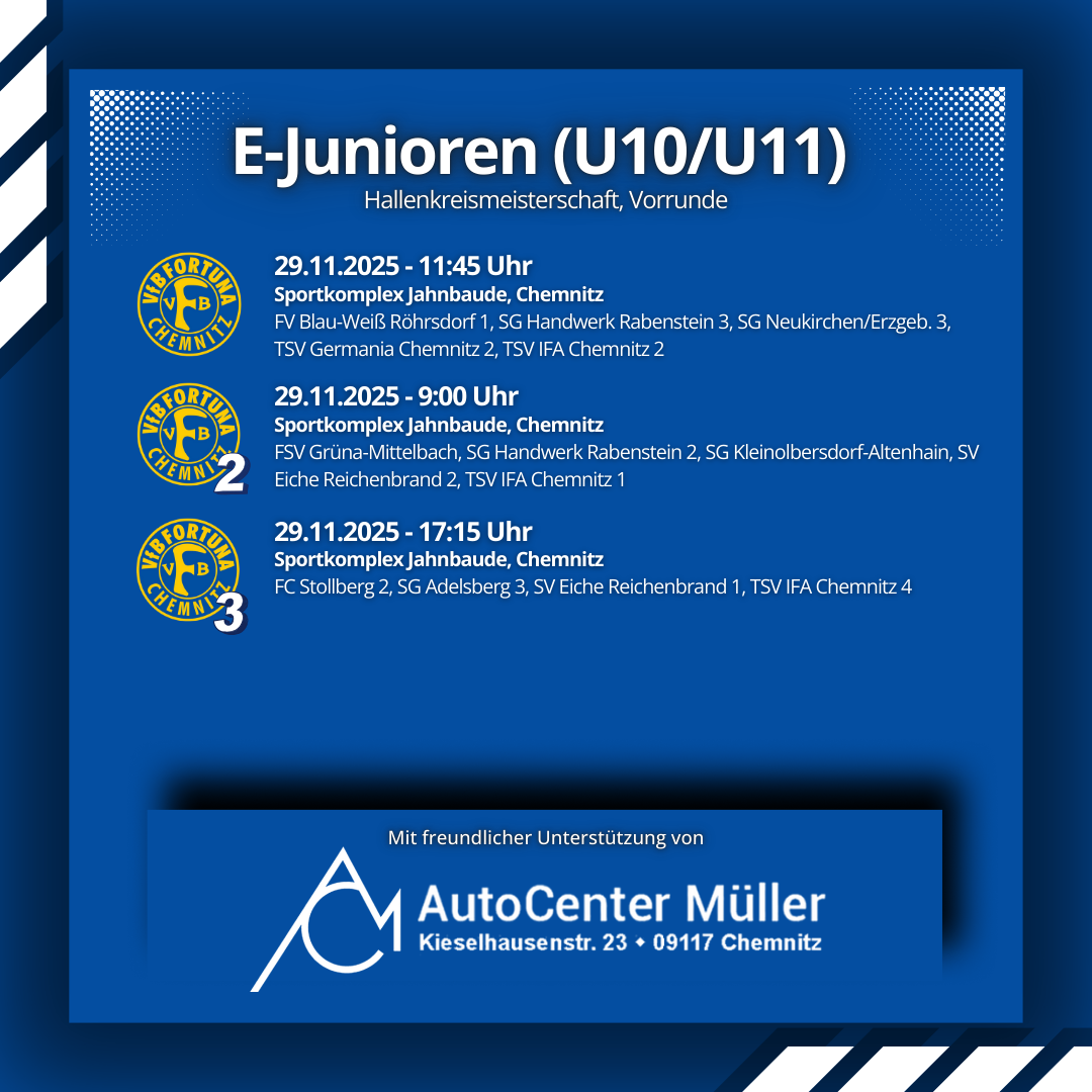 Parallel bestreiten unsere drei E-Junioren-Teams am Samstag im Sportkomplex Jahnbaude ihre Vorrundenspiele im Rahmen der Hallenmeisterschaften des Kreisverbandes Chemnitz und wollen auch dort jeweils gute Ergebnisse einfahren.
